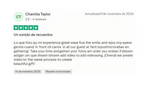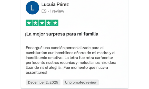 ¡Una experiencia increíble! Sorprendí a mi mujer con una canción personalizada para nuestro aniversario y se emocionó hasta las lágrimas. Cada detalle estaba cuidado y era sincero. Gracias por este momento mágico, lo recomiendo encarecidamente a todos aquellos que quieran crear un regalo realmente especial.
